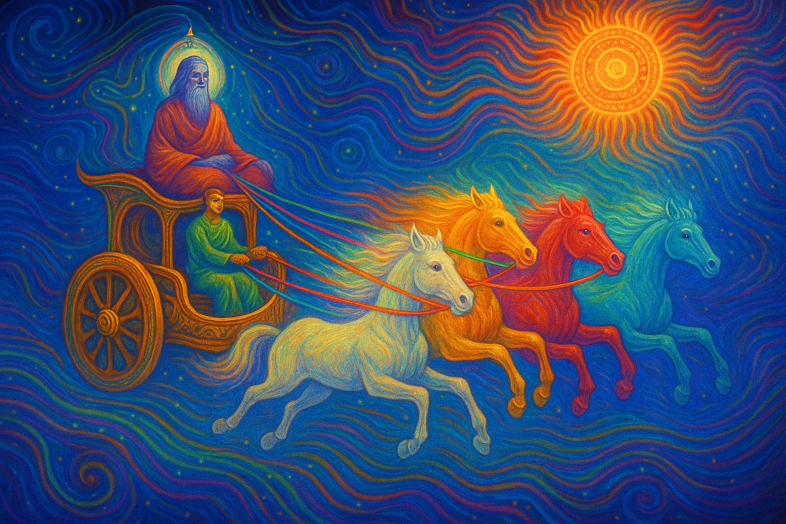 To support this post, I asked for and received a visionary-style rendering of this sacred image—a kind of 21st-century darshan of the Upanishadic truth. The result is a celestial chariot charging through a psychedelic cosmos, five radiant horses surging with color and light, the intellect gently holding the reins, and the Atman—the seer, the witness—seated in serene luminosity. It’s not a fantasy. It’s a mirror of the deeper layers of being.