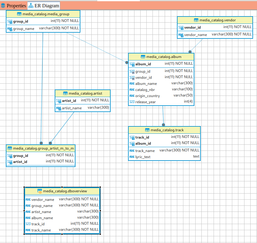 select vendor_name ,group_name ,artist_name ,album_name ,track_id ,track_name ,catalog_nbr ,origin_country ,release_year from media_group ,artist ,vendor ,album ,track ,group_artist_m_to_m where album.group_id = media_group.group_id and album.vendor_id = vendor.vendor_id and track.album_id = album.album_id and group_artist_m_to_m.artist_id = artist.artist_id and group_artist_m_to_m.group_id = media_group.group_id and media_group.group_id = album.group_id
